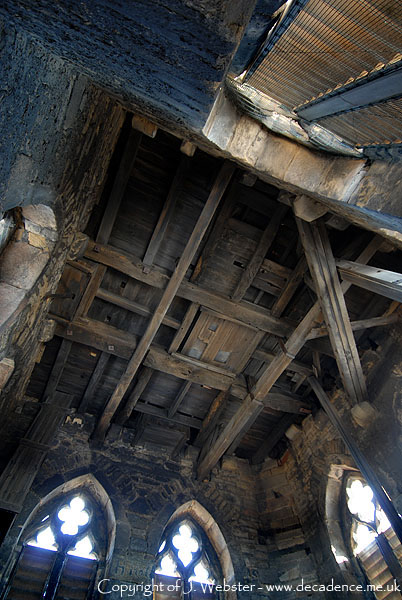 Photo taken in the belfry showing the base of the wooden spire